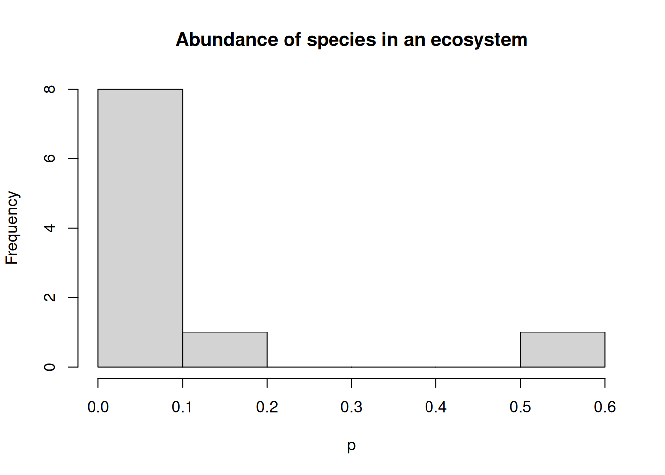 diversity_index <-function(x, alpha) {if (alpha !=1) {sum(x^alpha)^(1/ (1- alpha)) } else {exp(-sum(p *log(p))) }}set.seed(54321)p <-sort(gpindex::scale_weights(rlnorm(10)))hist(p, main ="Abundance of species in an ecosystem")