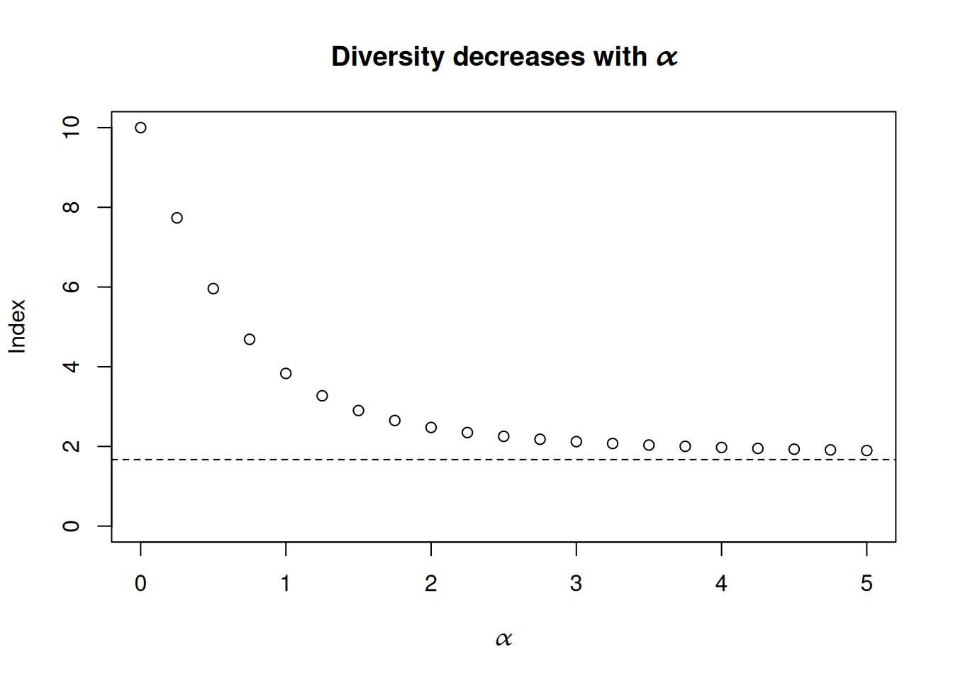 Formulating \(N_{\alpha}\) as a generalized mean shows a clear link between diversity indexes and concentration indexes, as \(N_{2}\) is the reciprocal of the well-known Simpson index (or Herfindahl–Hirschman index if you’re an economist). (It also shows a link with measures of entropy, as \(\log(N_{\alpha})\) is a generalization of Shannon entropy.) What makes a diversity index different from a measure of concentration (or entropy) is that it expresses diversity in terms of the effective size of the ecosystem that would give rise to a particular concentration of species if species were all equally abundant. Intuitively, \(1 / p_{i}\) gives the effective size of the ecosystem if all species were as prevalent as species \(i\). Rather than considering a single species, \(N_{a}\) uses the average abundance across all species to arrive at a measure of diversity.