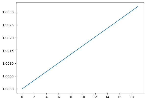 We’ll also make a function to oscillate prices. The idea is to form a chain of index values that starts with both products having a price of [1, 1], switches prices between [1, 1.1] and [1.1, 1] some number of times, and ends with prices back at [1, 1]. As a chained index is just the cumulative product of these index values, we can decompose the chained index into the product of the first and last change in price, and the product of the oscillations. What’s necessary to drive inflation is that the product of the oscillations is greater than 1.